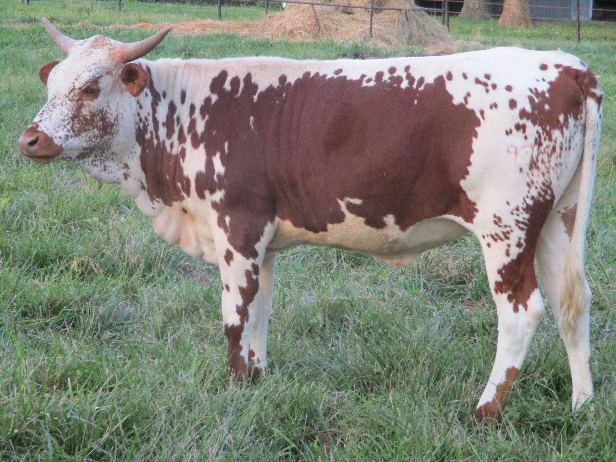 Beautifully marked lacy faced daughter of JH Rural Safari Son with very nice conformation, horns beginning to triple twist. is an outstanding mother who calves every 11 months like clockwork ans us one of the first to come up and be hand fed treats; she has been in numerous photo shoots and petting zoo events, This sweet lady's pedigree includes JP Rio Grande, VJ Tommie, Poco Lady BL, and Maximus ST. This is a difficult one to let go and is perfect for those looking to add twist in their program.