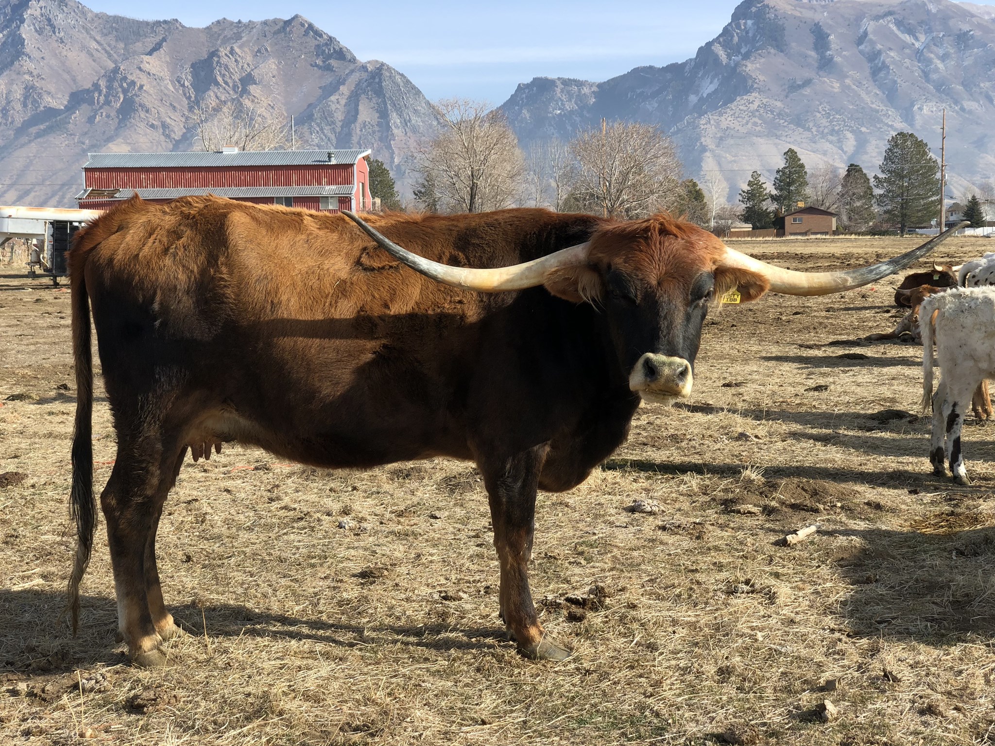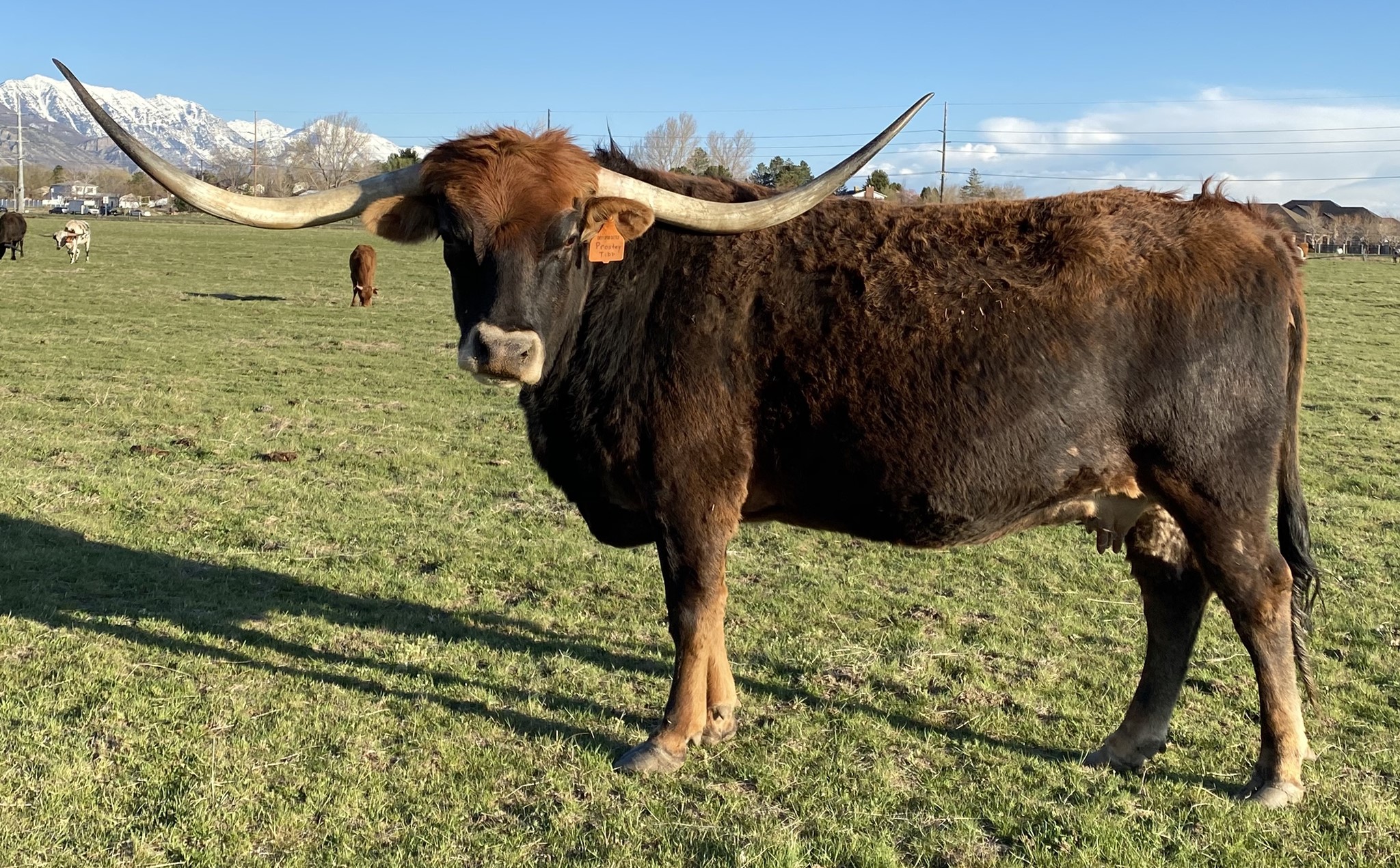 Prostey Tibb is a beautiful parker brown that is just beginning to melt into that beautiful coat. She had extreme backward and downward horn direction when she was young, and Darol said it was the most extreme he has ever raised. The beautiful thing is she's throwing that same horn shape on all of her offspring. Prostey Tibb gave us a beautiful Saddlehorn heifer on July 8, 2018. She is a beautiful black and white paint color that is a knock out! We named her Side Saddle. In 2019 she gave us a beautiful black with frosty specks also out of Saddlehorn that we are thrilled with as well. In 2020 & 2021 she gave us beautiful bull calves out of Cowboy Flair that have a chance to be a herd sire. She is bred back to Cowboy Flair for a Fall 2022 calf.