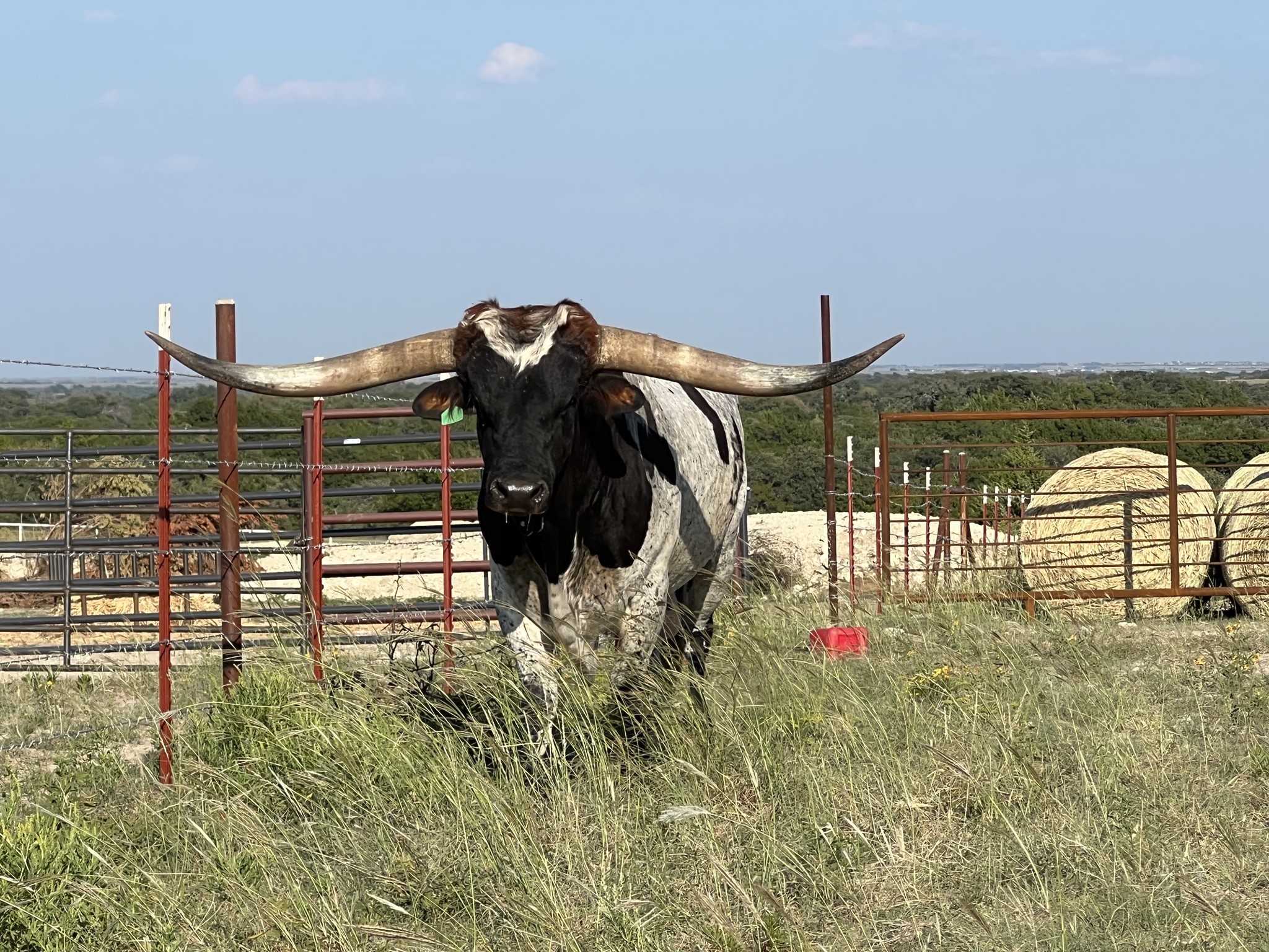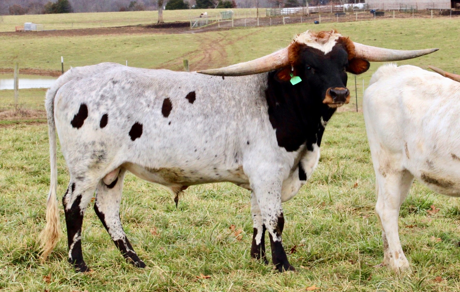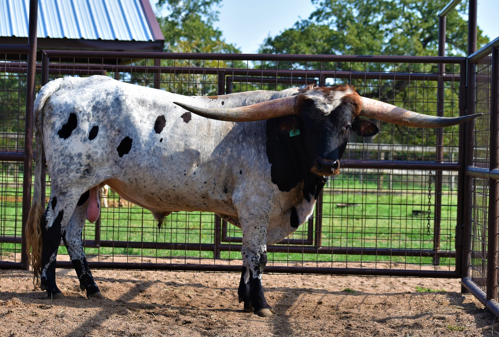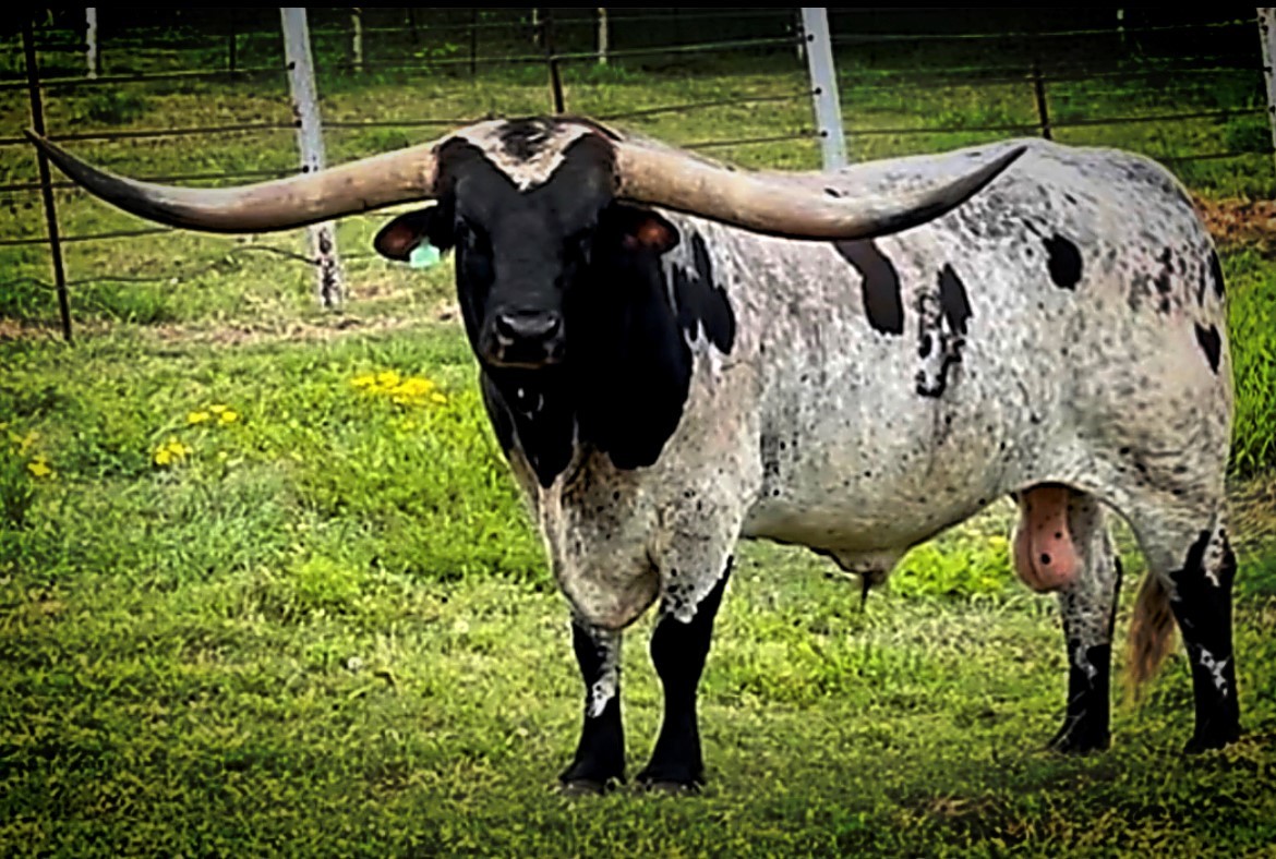 This bull has been in hiding but 2023 is a big year for him. He will be bred to some of the biggest horn young females in the breed. RJF Lock & Load is sired by the World Record holding longest horn bull Cowboy Tuff Chex 105.625" T2T and out of the World Record holding cow for total horn M Arrow Cha-Ching 103.75" T2T. Unmatched genetics that will take your program to the next level.