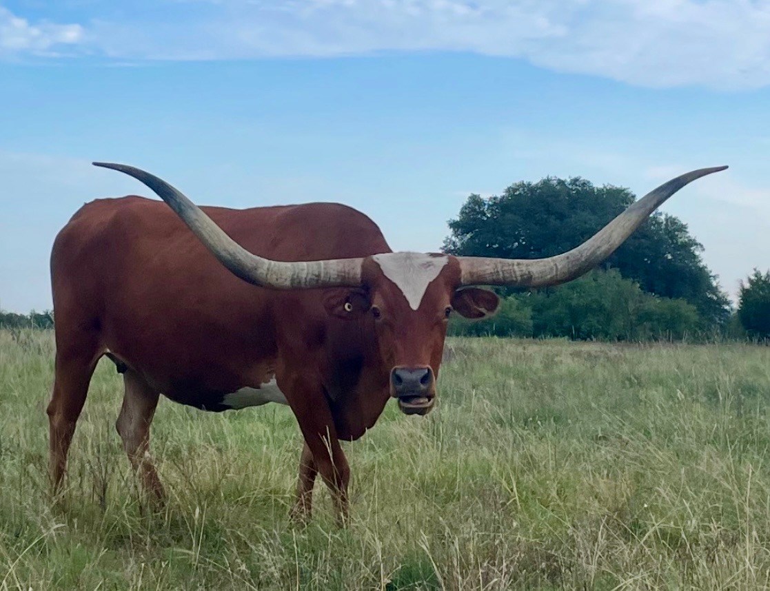 Big framed cow that is easy going as they come. When we purchased this cow in 2024 and she miscarried just a few days after the gentleman dropped her off from the trailer. We think there might have been an accident in the trailer. She rebounded well and in 2025 she gave us a very nice heifer out of Batman that is starting to brindle. Her beautiful rolling horns measured over 82" back in March of 2025 and we'll update her measurement in the spring of 2026.